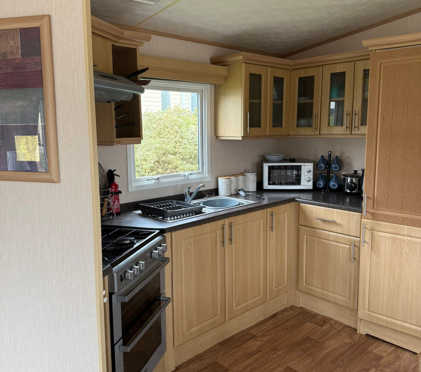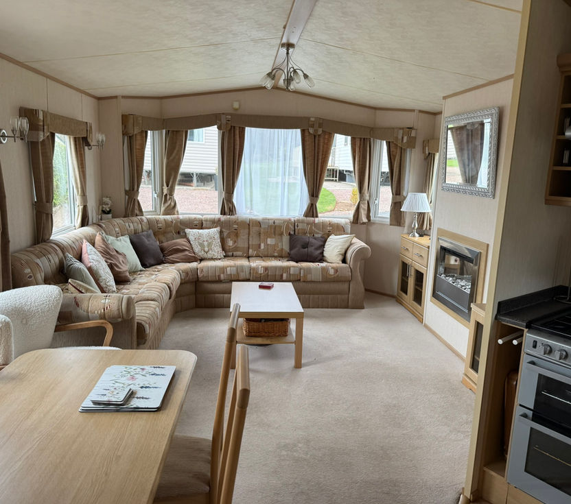 This 2010 ABI Brisbane (36ft x 12ft) is a spacious and well-kept 2-bedroom static caravan, ideal for comfortable countryside breaks. The open-plan living area offers plenty of natural light, with wraparound seating, a fold-out sofa bed for extra guests, and an electric fire creating a cosy feel. The kitchen is fully fitted with good storage, a gas oven and hob, integrated fridge/freezer, and a dining area with freestanding table and seating.